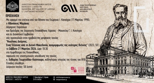 Η Δημοτική Πινακοθήκη Λάρισας – Μουσείο Γ. Ι. Κατσίγρα σε συνεργασία με την Εταιρεία Ελλήνων Ιστορικών Τέχνης διοργανώνει το Σάββατο 21 Μαρτίου 2026, ώρα 6:30 μμ προβολή της ψηφιακής ταινίας «Νικόλαος Δούμπας. Ένας Έλληνας από τη Δυτική Μακεδονία, αναμορφωτής της νεότερης Βιέννης», στο Αμφιθέατρο της Πινακοθήκης, παρουσία της καθηγήτριας ιστορίας της τέχνης του ΑΠΘ Ευθυμίας Γεωργιάδου-Κούντουρα, επιστημονικά υπεύθυνης για την ταινία.